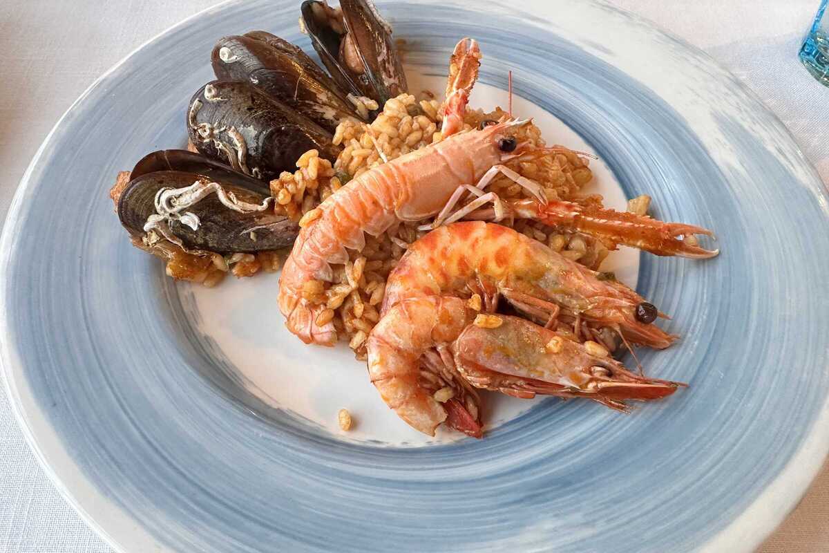 The room itself is linen tablecloths, wooden beams and seafaring paintings. The terrace is the real draw – close enough to the water to hear the waves, busy by day, sweeping at night. Mains run from €20, a paella meal from €40 – worth it for a seat by the water. Tables fill quickly; lunch-only service on Sundays and Tuesdays narrows the dinner window to Wednesday through Saturday, and the restaurant is closed Mondays.
